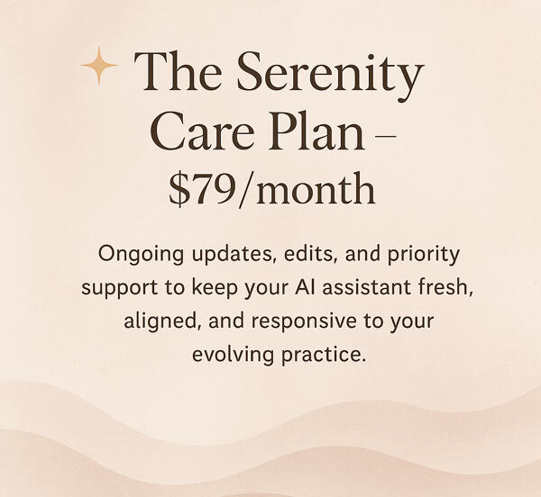 Includes The Signature Experience, three months of Serenity Care, and all premium upgrades — for the practitioner who’s ready to step fully into ease, elegance, and automation.
