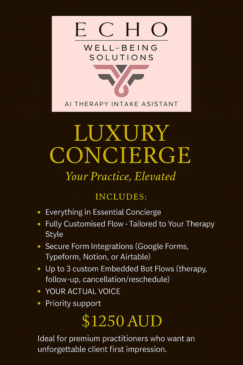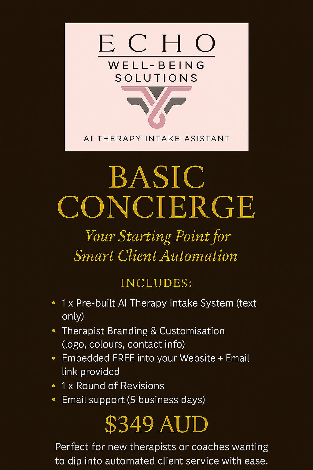 At ECHO Well-being Solutions, our packages are thoughtfully designed to change that.With a beautifully personalised AI assistant — in your tone, your language, and your flow — you can:💬 Greet your clients with warmth, clarity, and compassion — 24/7🧠 Handle your most time-consuming admin automatically🎙️ Speak in your tone, follow your flow, and reflect your values⏳ Give you your time, energy, and focus back🌿 Help you grow your practice with more ease, not more effort
