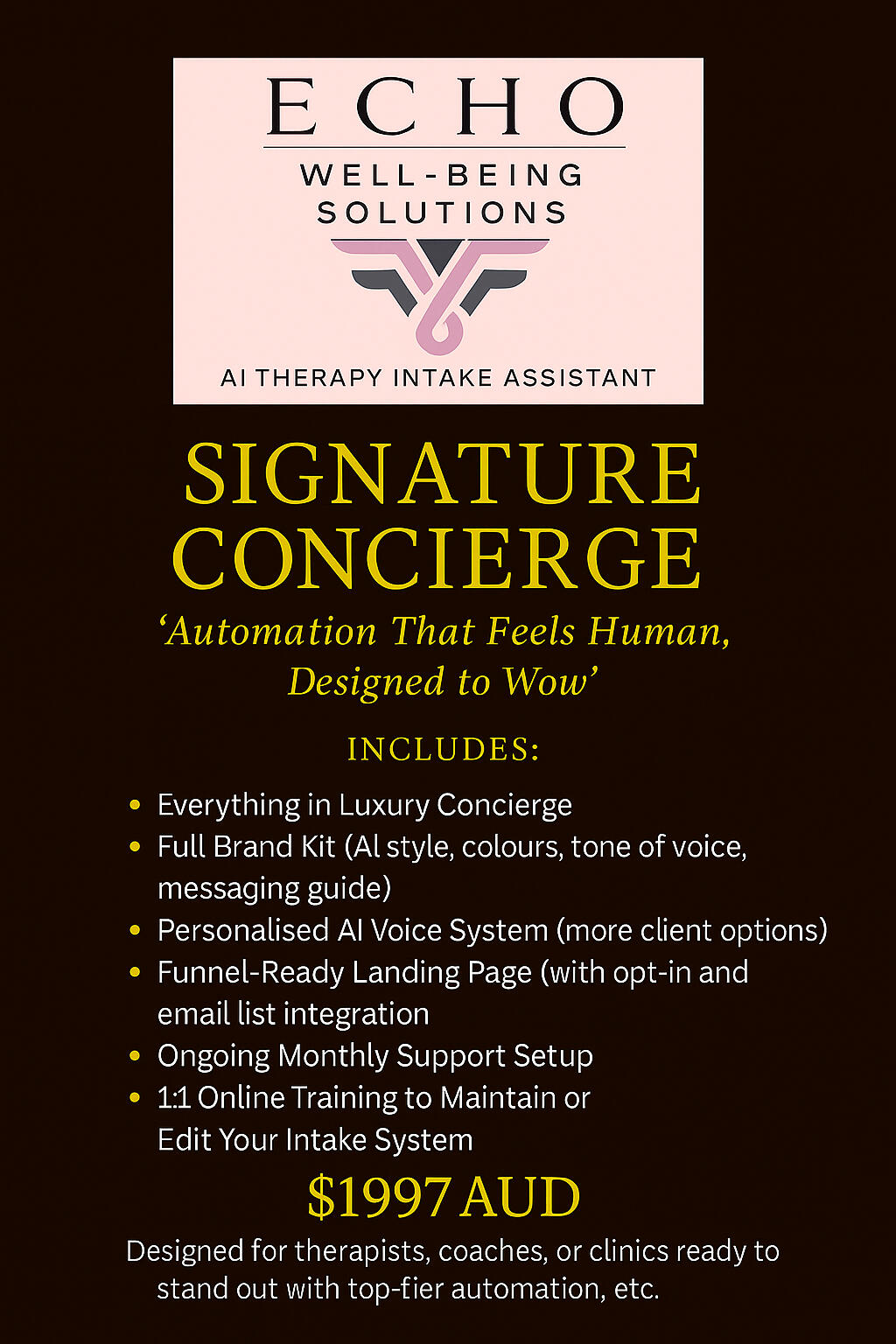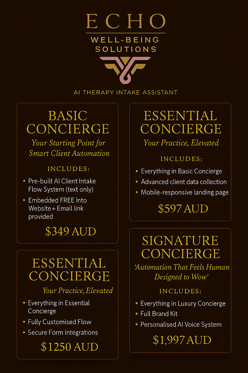 At ECHO Well-being Solutions, our packages are thoughtfully designed to change that.With a beautifully personalised AI assistant — in your tone, your language, and your flow — you can:💬 Greet your clients with warmth, clarity, and compassion — 24/7🧠 Handle your most time-consuming admin automatically🎙️ Speak in your tone, follow your flow, and reflect your values⏳ Give you your time, energy, and focus back🌿 Help you grow your practice with more ease, not more effort