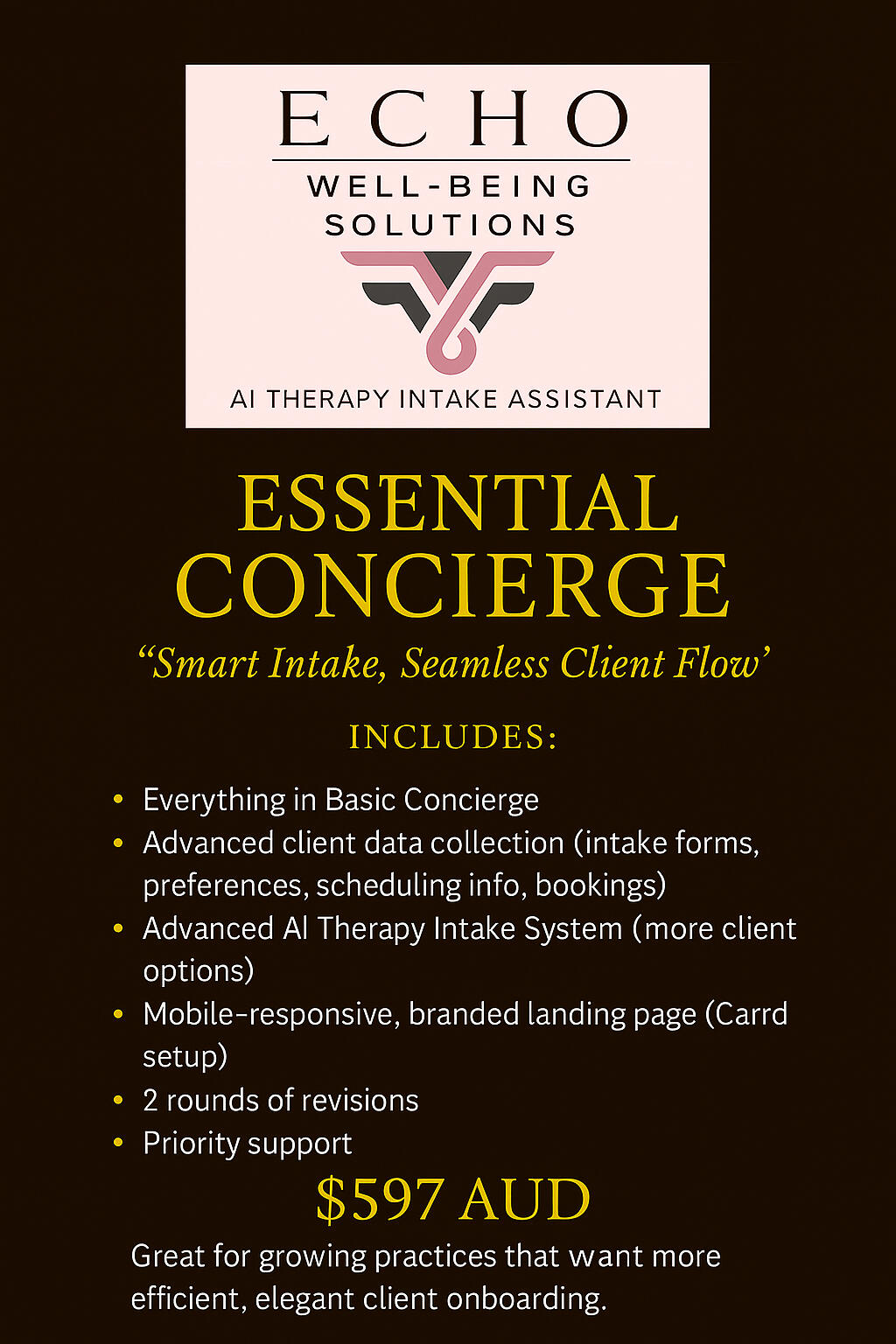 At ECHO Well-being Solutions, our packages are thoughtfully designed to change that.With a beautifully personalised AI assistant — in your tone, your language, and your flow — you can:💬 Greet your clients with warmth, clarity, and compassion — 24/7🧠 Handle your most time-consuming admin automatically🎙️ Speak in your tone, follow your flow, and reflect your values⏳ Give you your time, energy, and focus back🌿 Help you grow your practice with more ease, not more effort