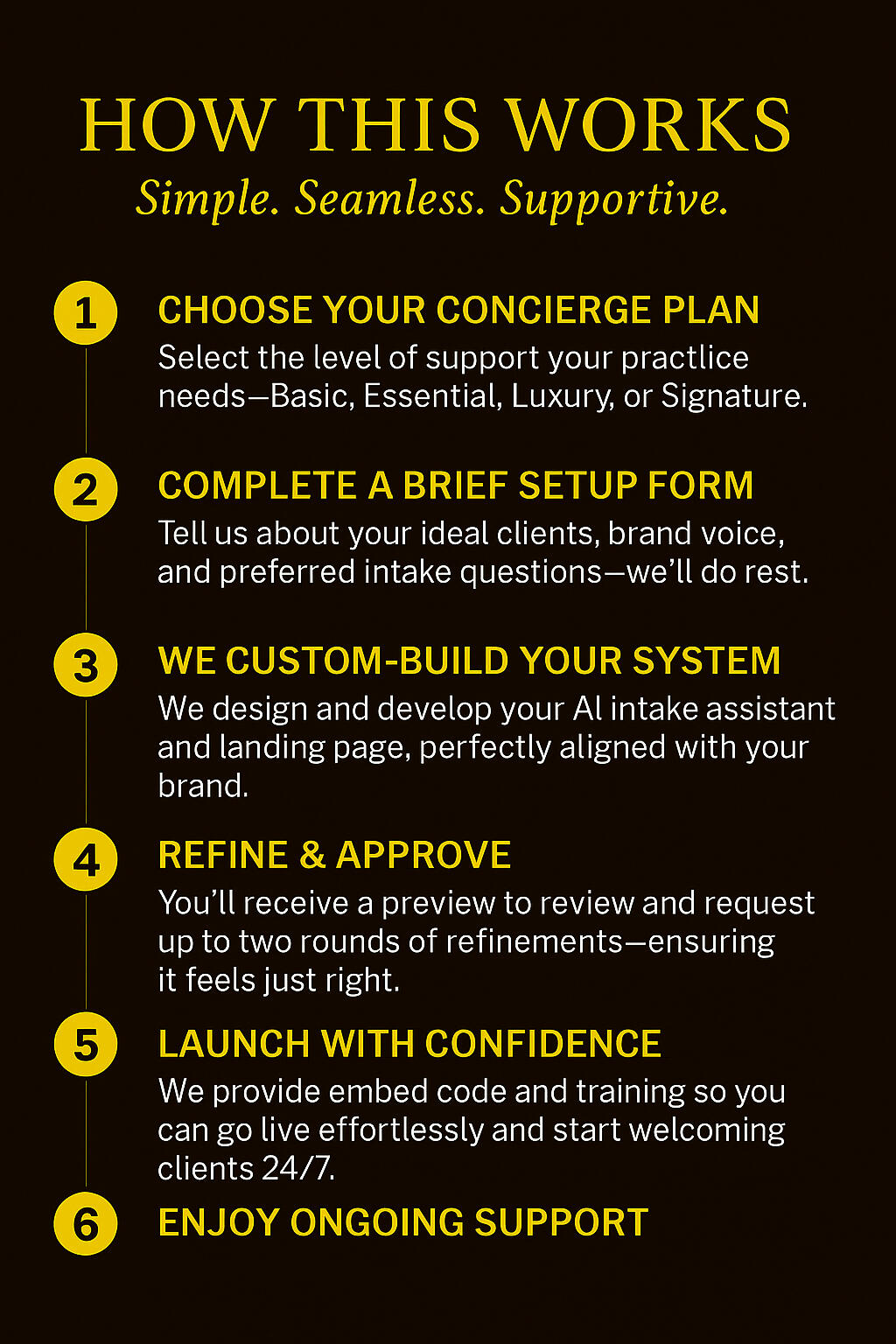 Everything in Basic Concierge — plus embedding, integration, and seamless client flow. A smart, calming assistant that blends beautifully into your website or systems.